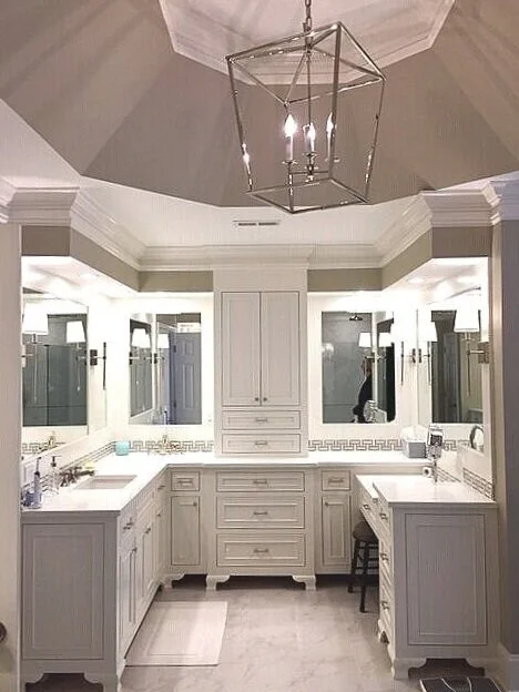 This White Columns renovation started with a dated master bathroom that lacked function as well as aesthetics. The project included repositioning of walls and restructuring the layout. All cabinetry, finishes, lighting, tile, and plumbing fixtures were the responsibility of Kala Designs, LLC and combined to create a lovely and restful bathroom oasis.